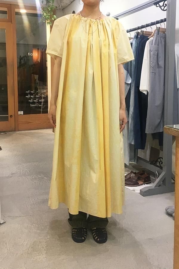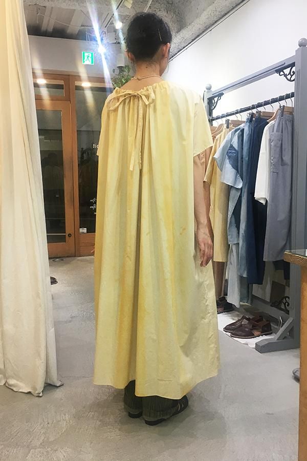 ネックラインに共生地のリボンテープが通してあり、絞って調節をして着用するデザインです。