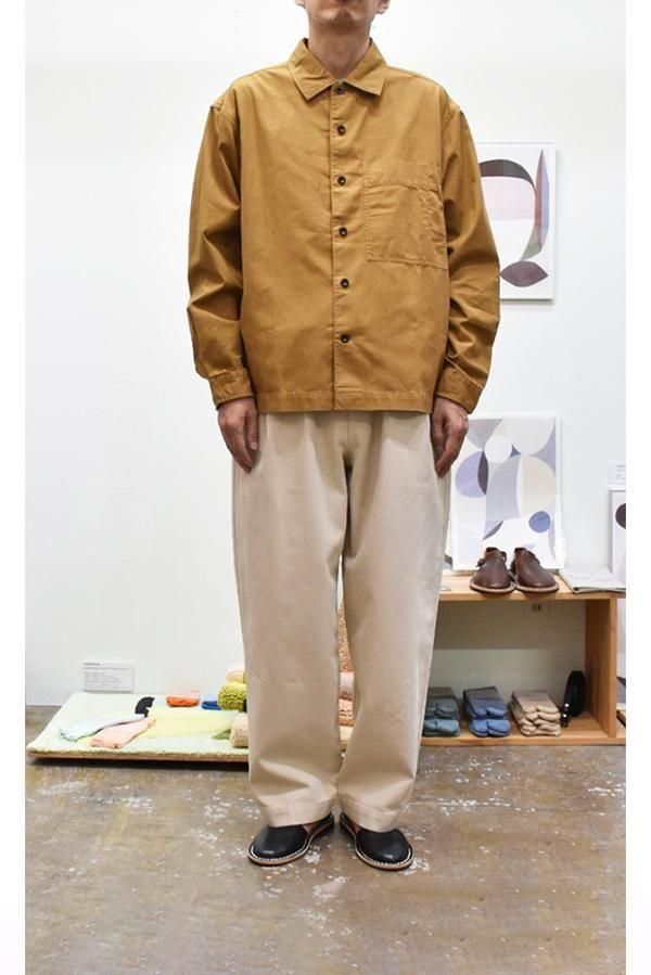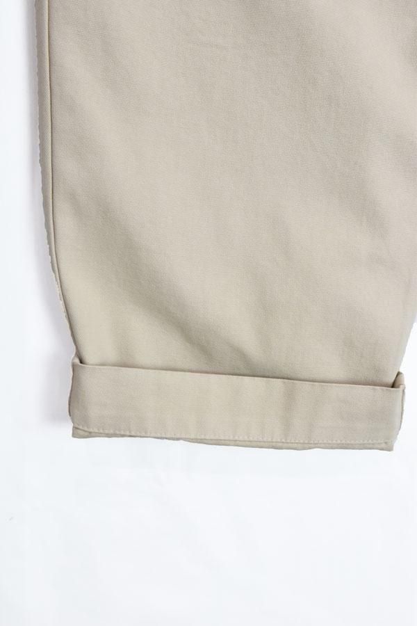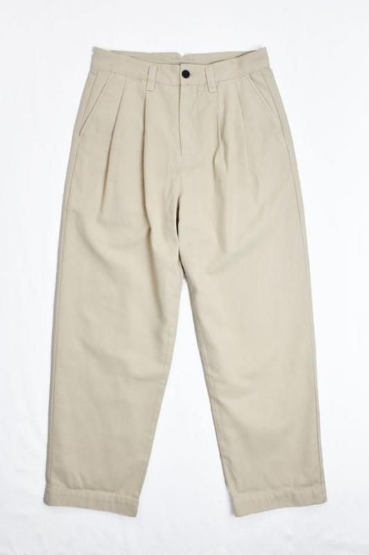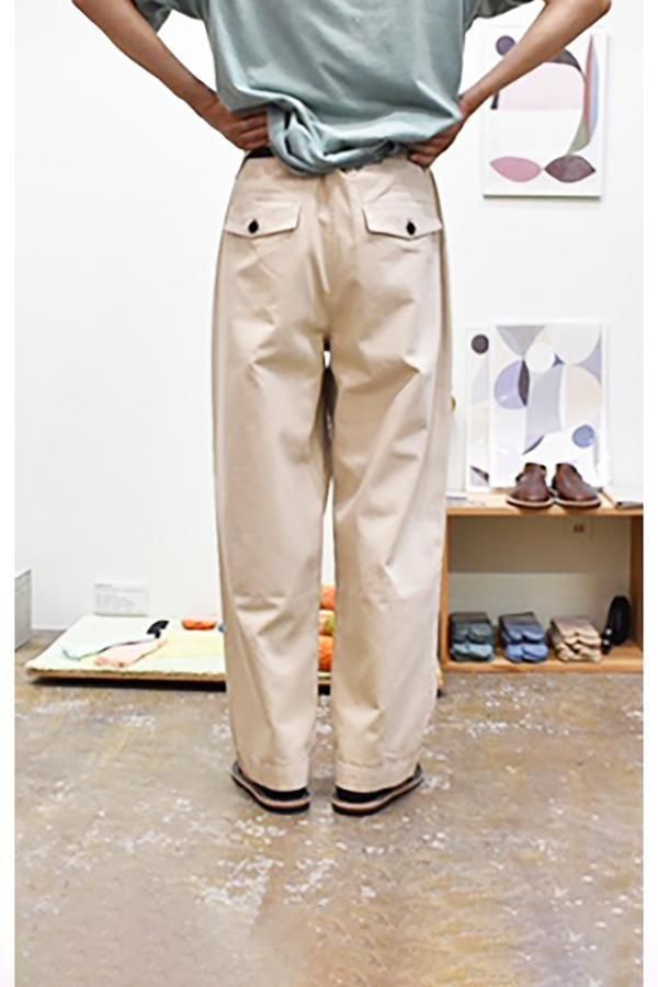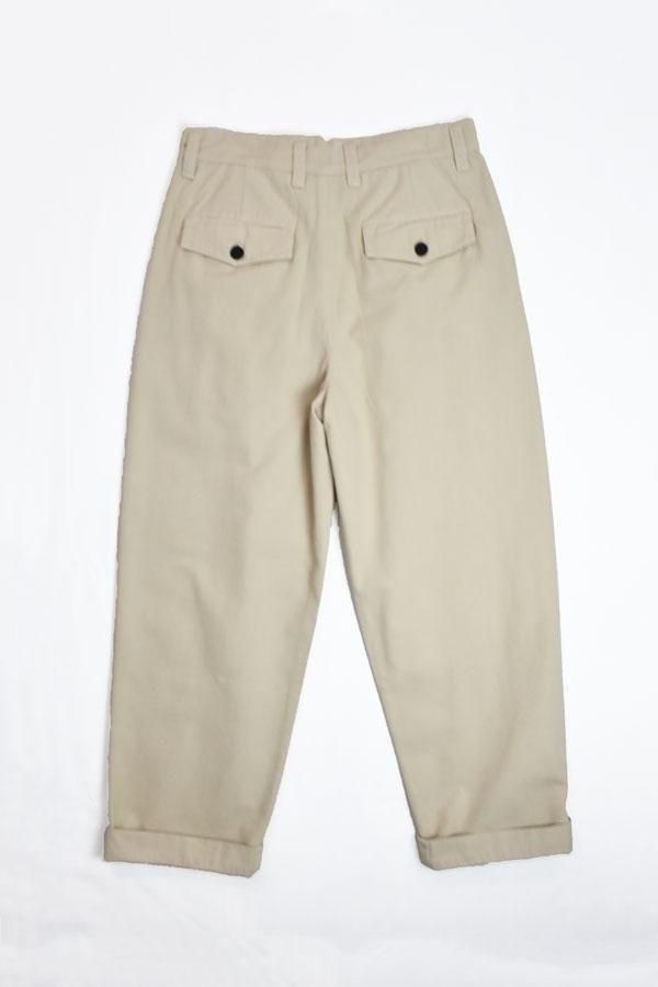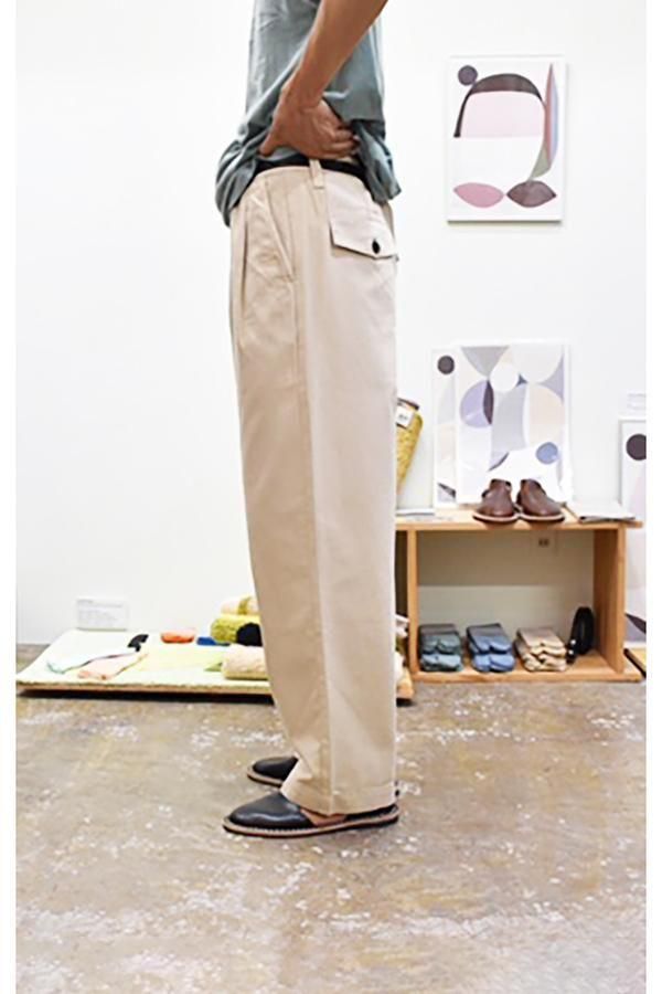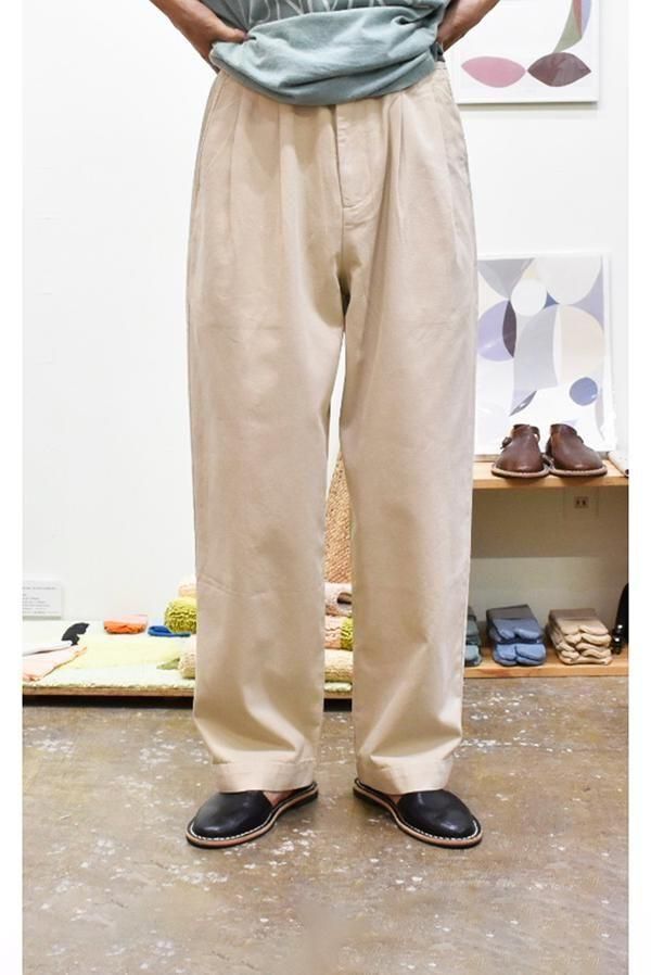 平織コットン、太めのシルエットの2タックパンツです。